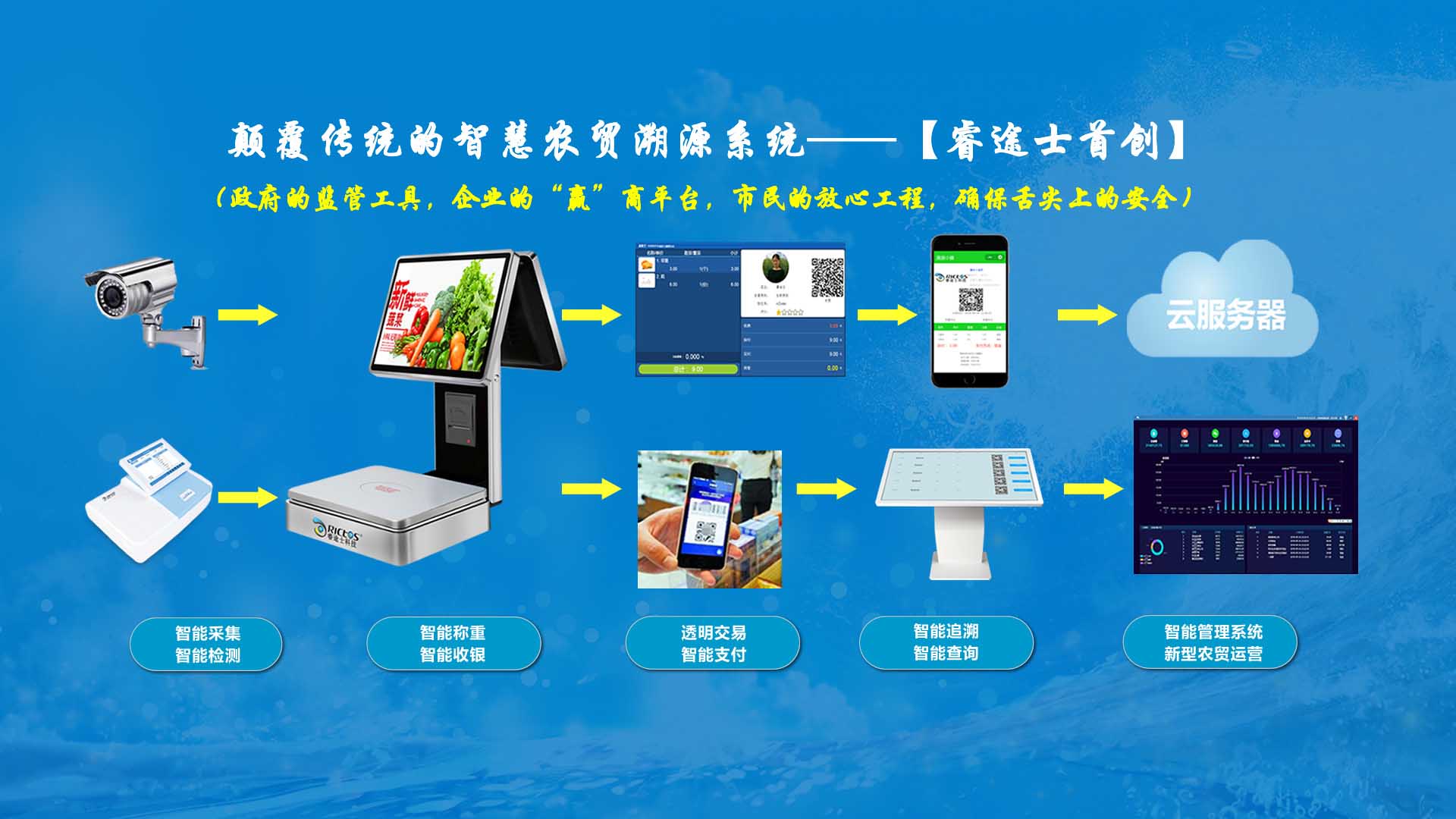 創(chuàng)新實(shí)現(xiàn)了【智慧農(nóng)貿(mào)溯源管理系統(tǒng)】與【智能稱重收銀】一體化解決方案,集市場管理、運(yùn)營管理、溯源追溯、智能收銀大數(shù)據(jù)運(yùn)用于一體,硬件、軟件與管理系統(tǒng)完美結(jié)合。適用于農(nóng)批、農(nóng)貿(mào)市場蔬菜、生鮮、水果、水產(chǎn)、肉類、熟食等稱重和非稱重銷售;由于采用一體化設(shè)計(jì),解決了傳統(tǒng)農(nóng)貿(mào)市場無法實(shí)現(xiàn)的信息化、智能化、可追溯的管理問題;使稱重、收銀、追溯、管理、更透明、公正、安全,讓顧客無后顧之憂,給管理工作帶來極大的便捷與高效,對國內(nèi)農(nóng)產(chǎn)品行業(yè)的發(fā)展、農(nóng)產(chǎn)品流通管理起到了典范作用。 【睿途士首創(chuàng)】顛覆傳統(tǒng)的“智慧農(nóng)貿(mào)市場系統(tǒng)”,解決了傳統(tǒng)農(nóng)貿(mào)系統(tǒng)單一安卓掛屏,昂視不方便看、不直觀、無互動(dòng)性,傳輸信息不齊全、不穩(wěn)定的問題,也解決了按鍵電子秤商品難找、商品代碼難記、按鍵操作不靈活、支付不智能,對收銀管理、銷售商品、菜名、菜價(jià)、打折、優(yōu)惠、會(huì)員、線上下單、采購等無法實(shí)現(xiàn)實(shí)際菜品交易和追溯等問題。 更具顛覆性的是睿途士智慧系統(tǒng)擁有三大管理平臺(市場管理平臺、總部運(yùn)營管理平臺、商戶后臺管理平臺)、一個(gè)可視操作前臺和三大追溯功能,讓遠(yuǎn)程管理、數(shù)據(jù)傳輸、人機(jī)互動(dòng)、智能控制、移動(dòng)支付、大數(shù)據(jù)、互聯(lián)通信、云端存儲(chǔ)、人工智能、智能城市、電子定位、智能收銀等功能得以實(shí)現(xiàn)。
